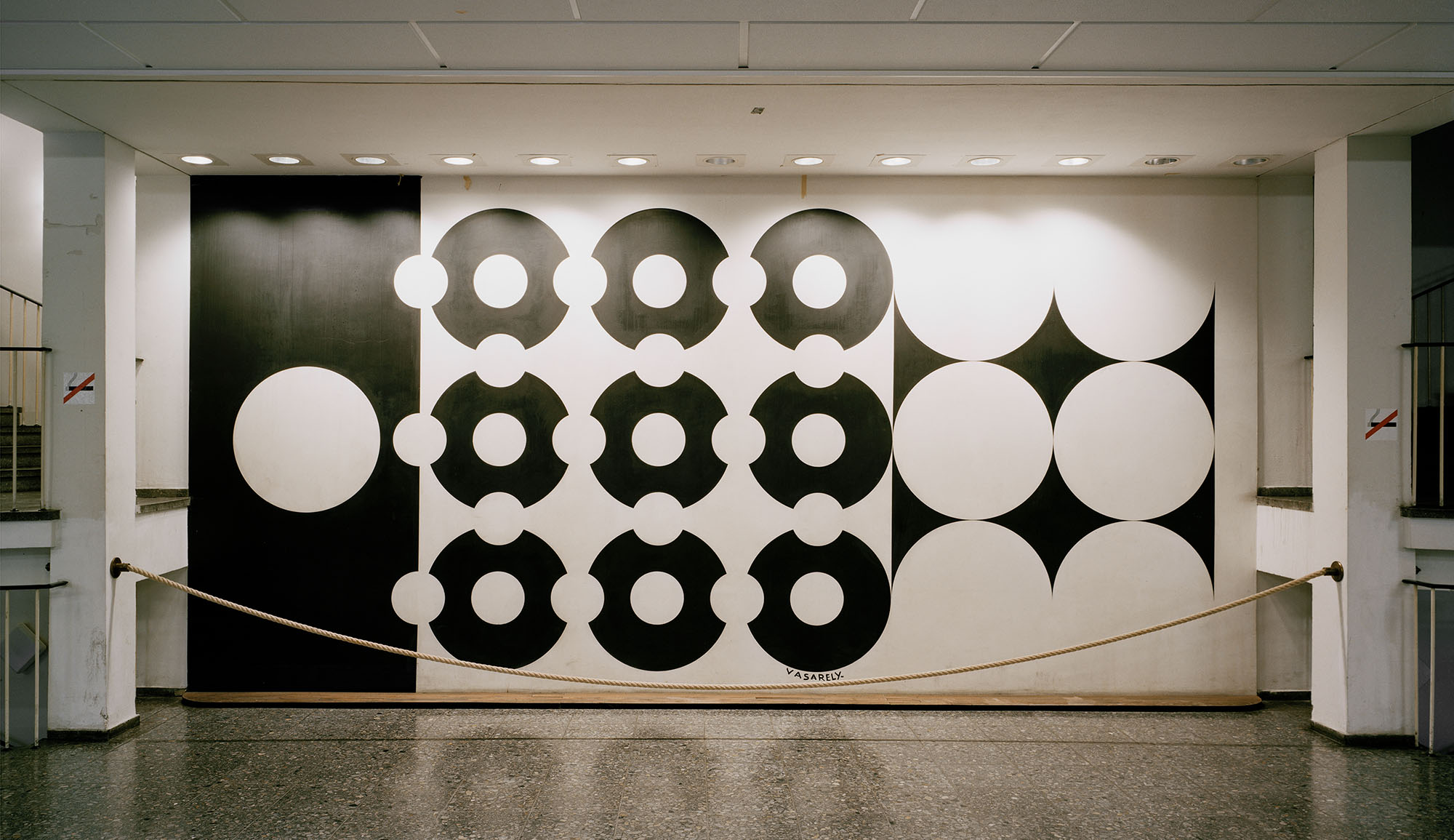 Despite his „proto-conceptual“ approach, Victor Vasarely signed his piece in an old-masterly manner at the inauguration in 1965. Over the years, the signature has changed from minuscules to majuscules.
