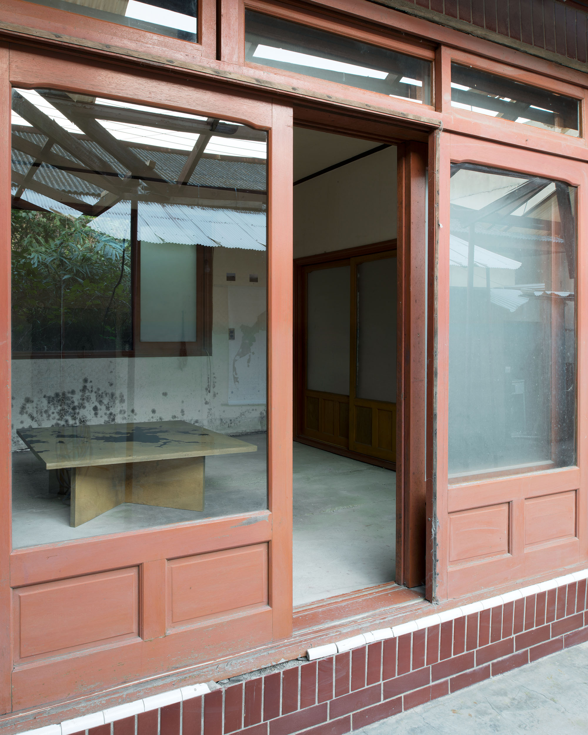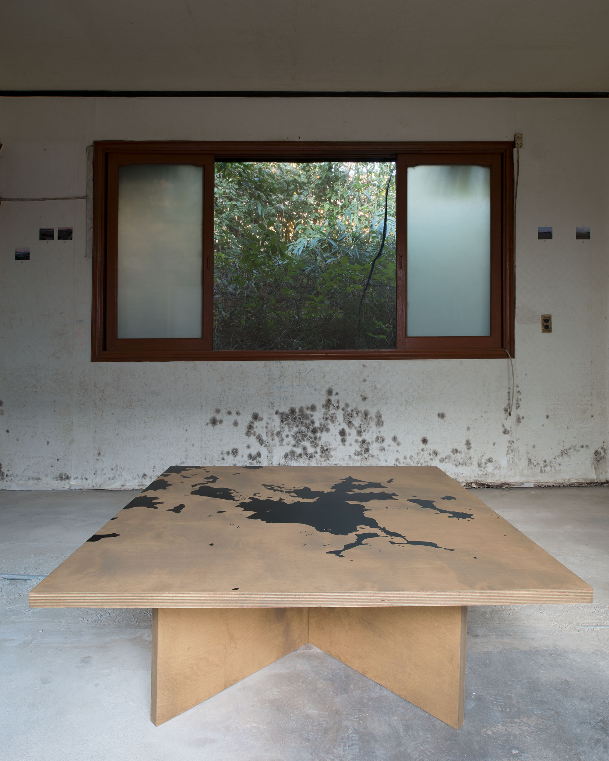 table, cut-plot out of adhesive foil, photo prints pinned to the walls,