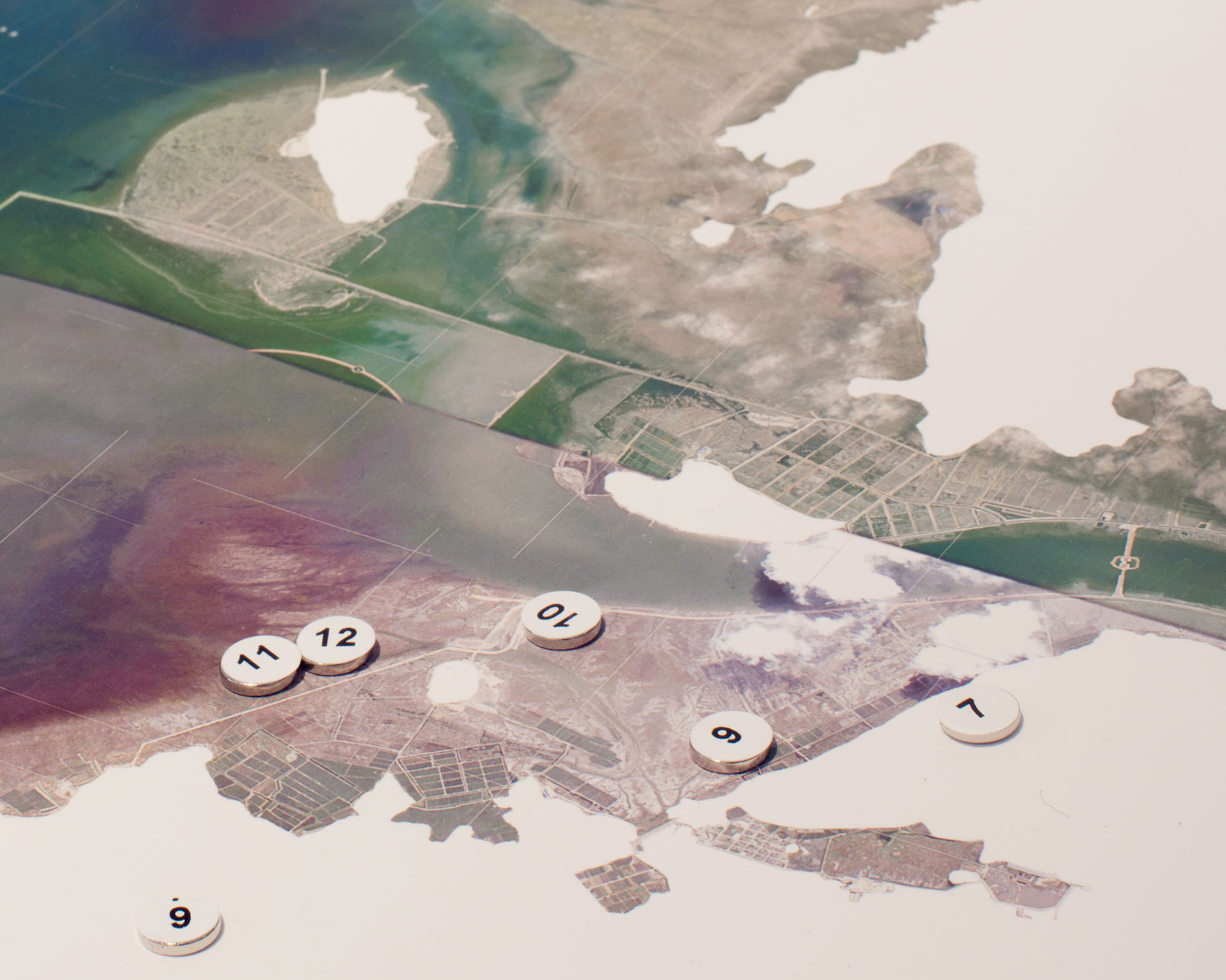 Since the ecological disaster that resulted from damming the bay, the land reclamation plots have been turned into artificial marshlands. The island on the right had been split by a quarry and was turned into rubble used as filling material for other land reclamation sites.