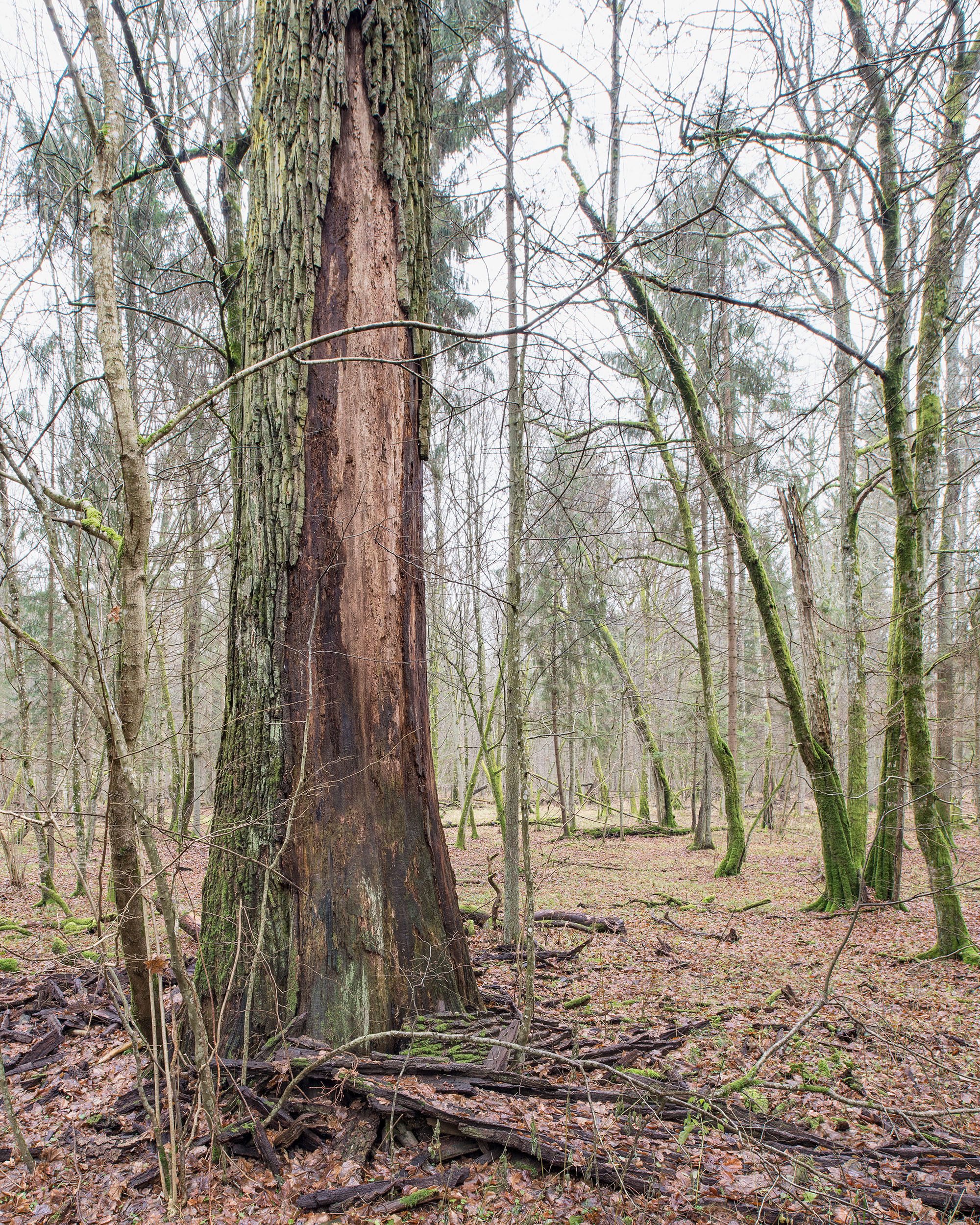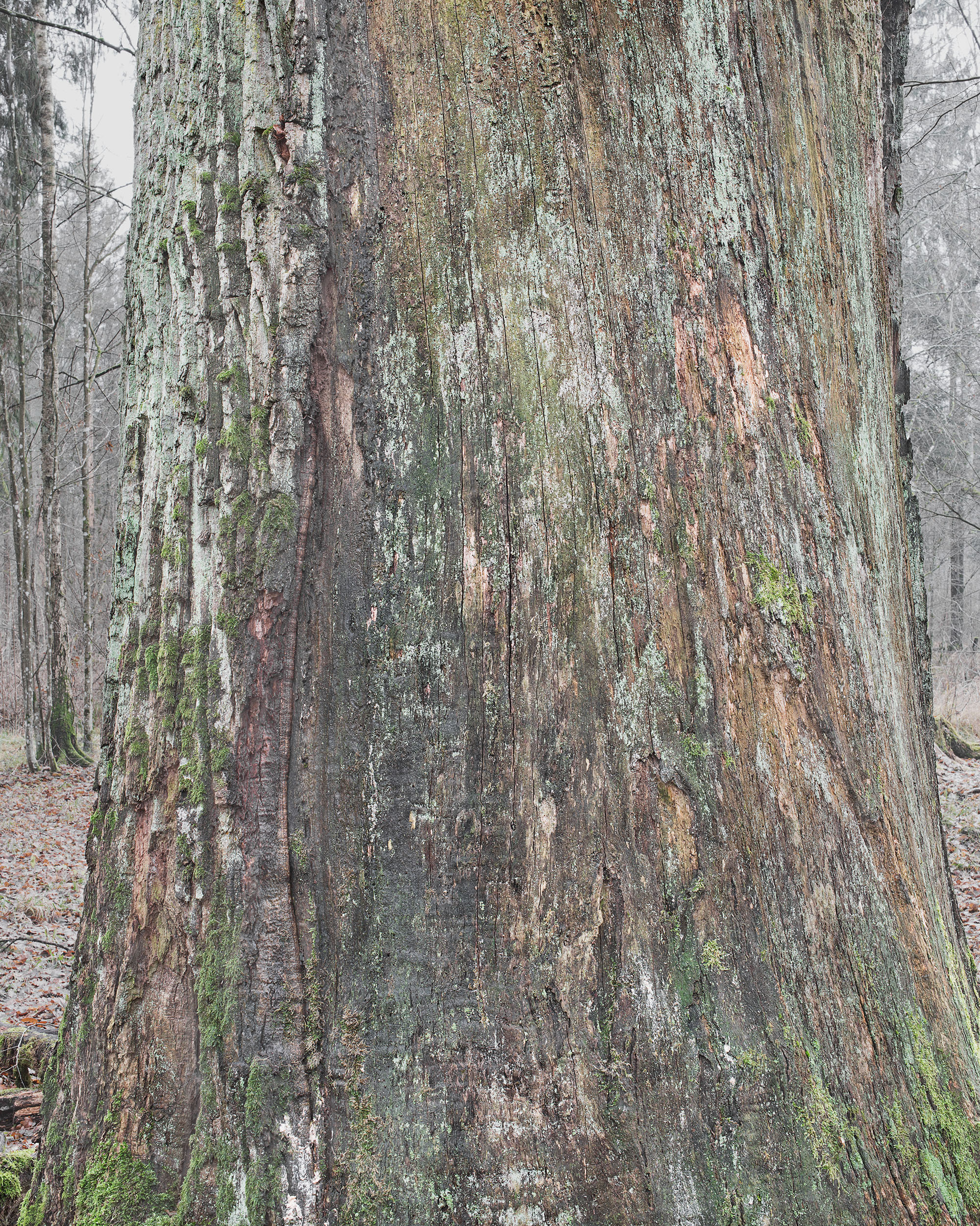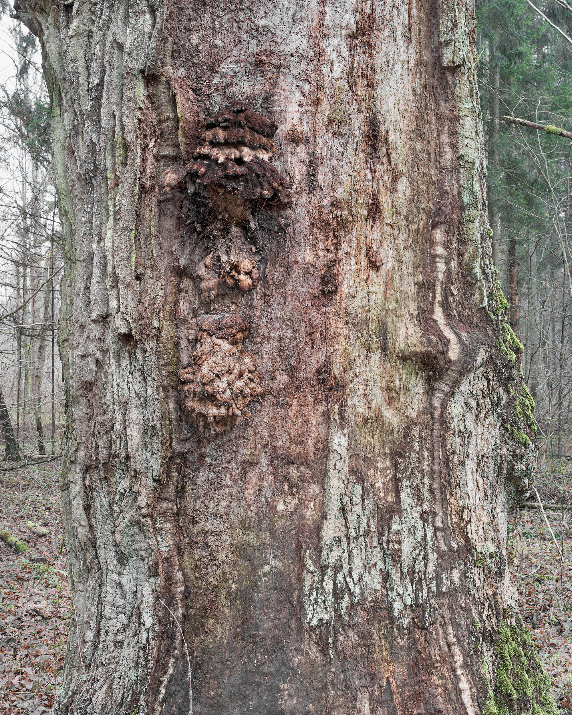 My photographs of forest landscapes oscillate between natural beauty and an uncanny atmosphere, recalling violent chaos and potential threats imposed by wilderness. In the project, they form the background for historical sources while aiming for reflections of our collective imagination of nature. During this fieldwork stage in 2017, I furthermore produced a “portrait series” of “royal oaks”. The forest received international attention back then, as the Polish government allowed logging in formerly protected areas. Białowieża is famous for its ancient oaks. Some reach ages of multiple centuries. However, their numbers are decreasing, and many of them are decaying. In a grove with particularly old specimens, selected trees have been named after Polish and Lithuanian kings who played crucial roles in the history of the forest. Against the backdrop of the nationalistic atmosphere of the time, the personification of trees appeared as a nostalgic illustration of the country’s powerful history that sadly coincided with the extensive destruction of its natural resources and heritage.