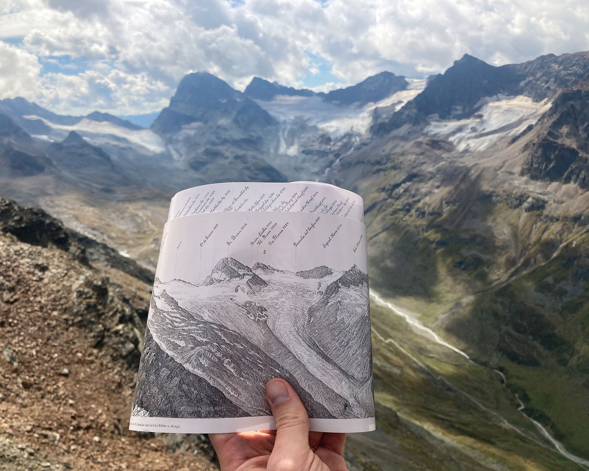 The project is a performative attempt to repeat a series of historical photographs by Thaddäus Immler, a photo pioneer and alpinist from Bregenz, Austria. In 1887, Immler produced the oldest known photos of the Silvretta mountain range. They became the source for a panoramic drawing by Julius Ritter von Siegl that was published in 1888. The panorama is a rare document of the region's vast cryosphere during the 19th century. Thus, it became an essential source for historians and glaciologists as the glaciers that were depicted receded dramatically during the 20th century. Some have almost vanished completely.