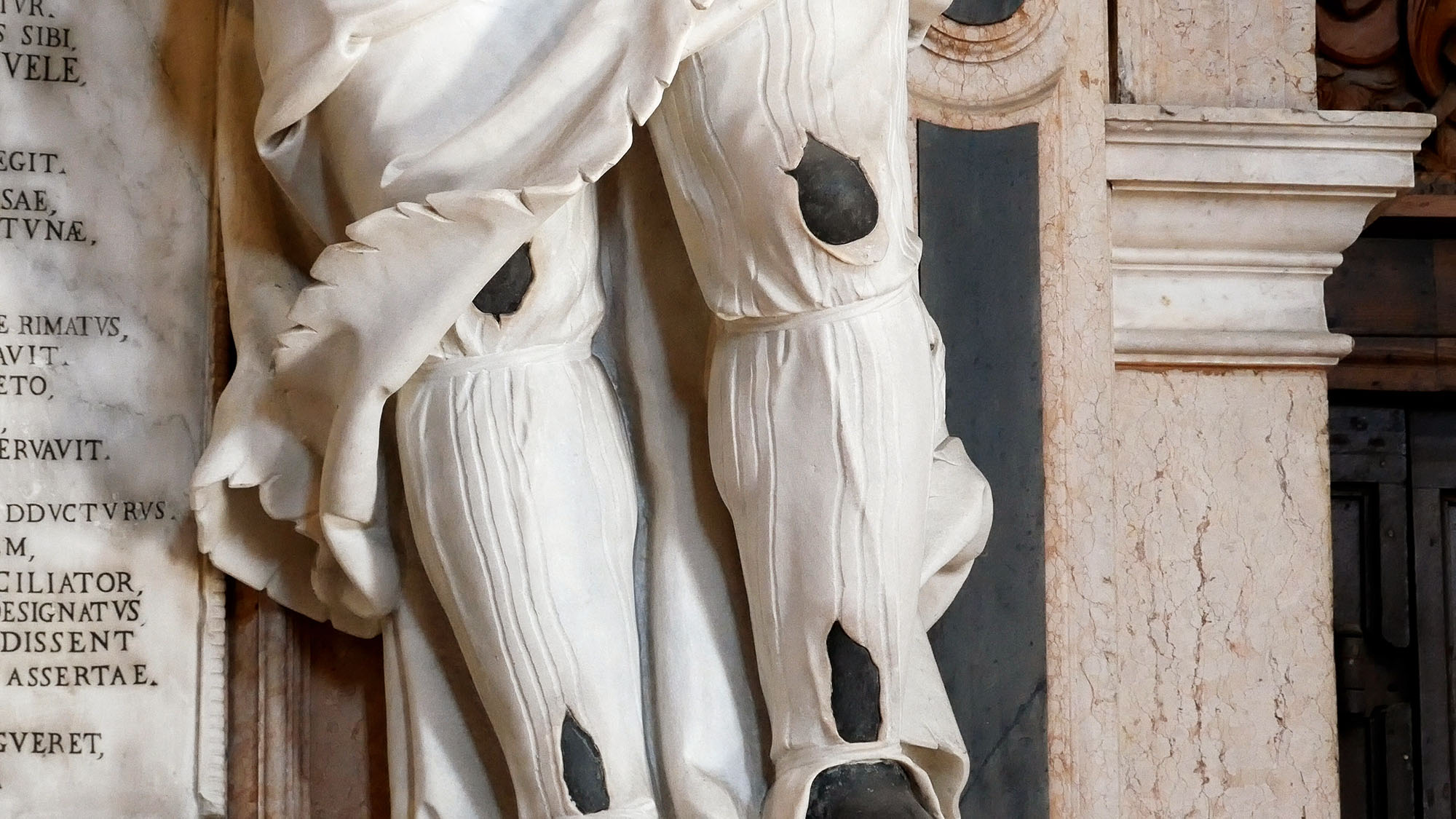 While the splendour of self-representation peaked in the 17th century, the political power of the Venetian Republic was already in decline. Despite his brief term in office, Doge Giovanni Pesaro was immortalised by a two-storey sepulchral monument located in the Basilica di Santa Maria Gloriosa dei Frari. In the upper section, the Doge is surrounded by allegories that highlight his glory. Below are four telamon figures sculpted as racist stereotypes of African slaves, struggling to bear the weight of the ruler.